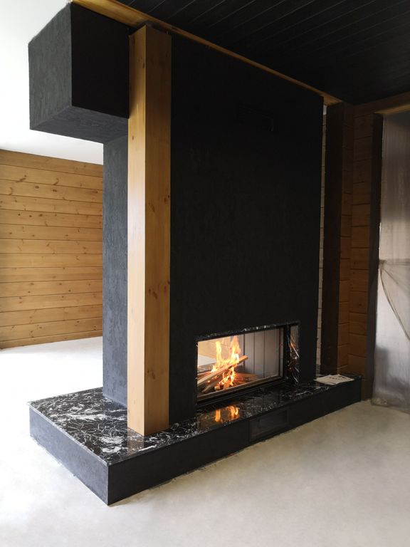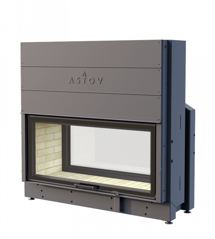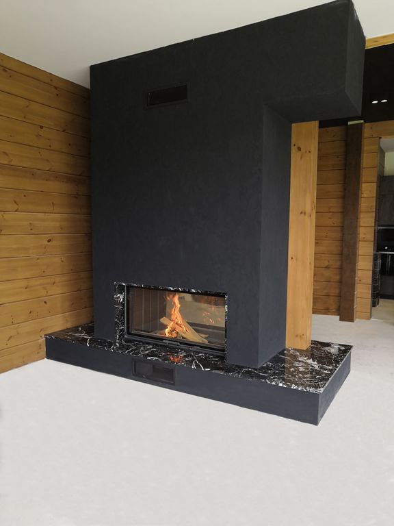 Широкая каминная топка с двумя дверками (туннельного типа). Одна дверка имеет подъёмный механизм, позволяющий открывать дверку вверх легко и бесшумно.
