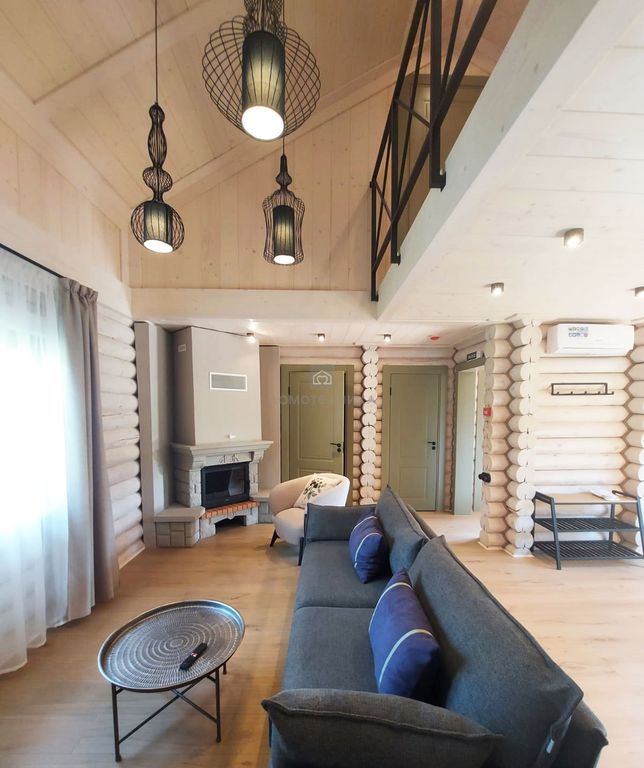 Угловой камин из желтого камня Sunrock, с каменной балкой.