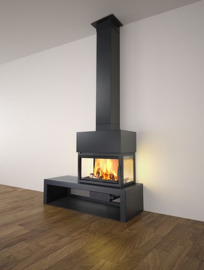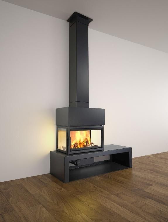Камин в стиле High-Tech LL-15D произведен испанской компанией. Фронтальный стальной камин с трехсторонним остеклением, банкетка слева.